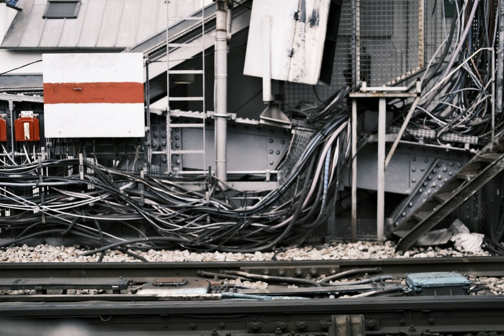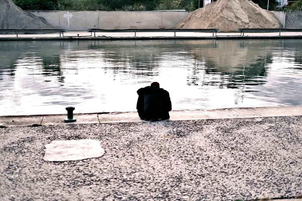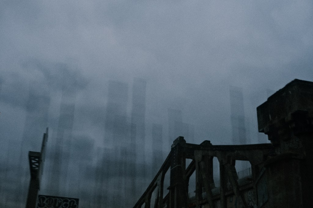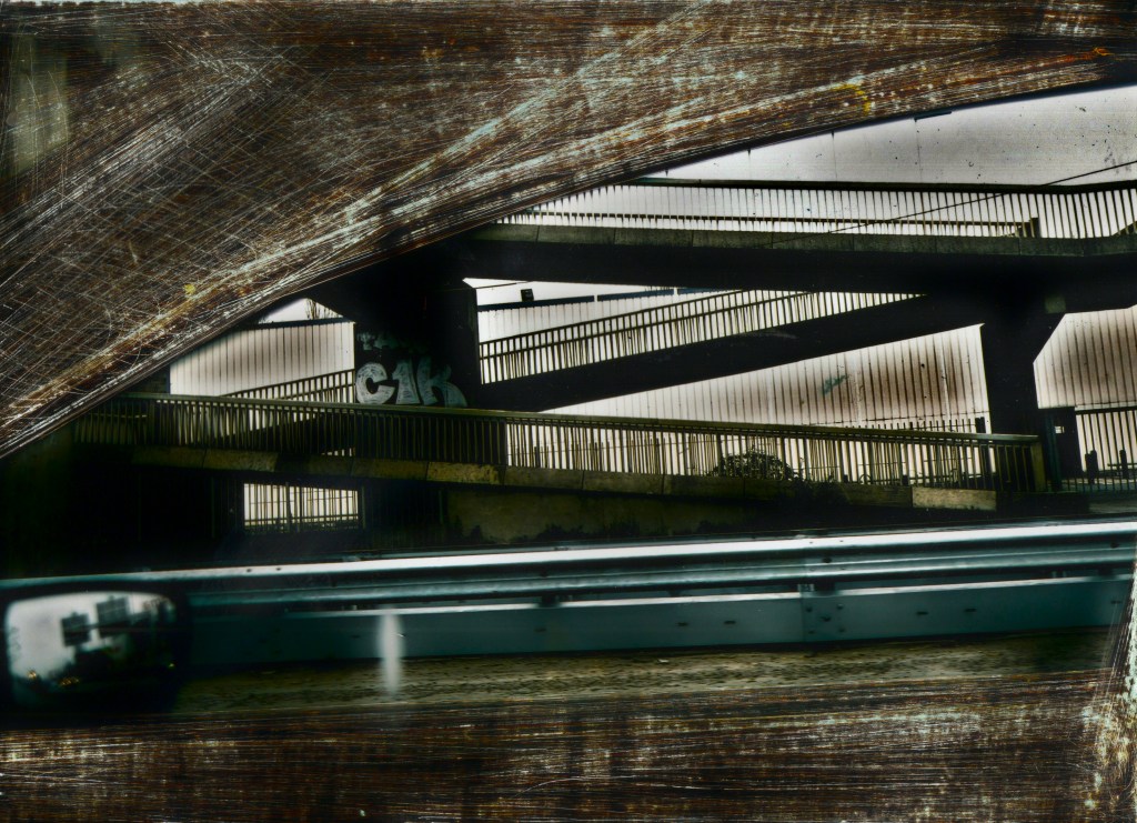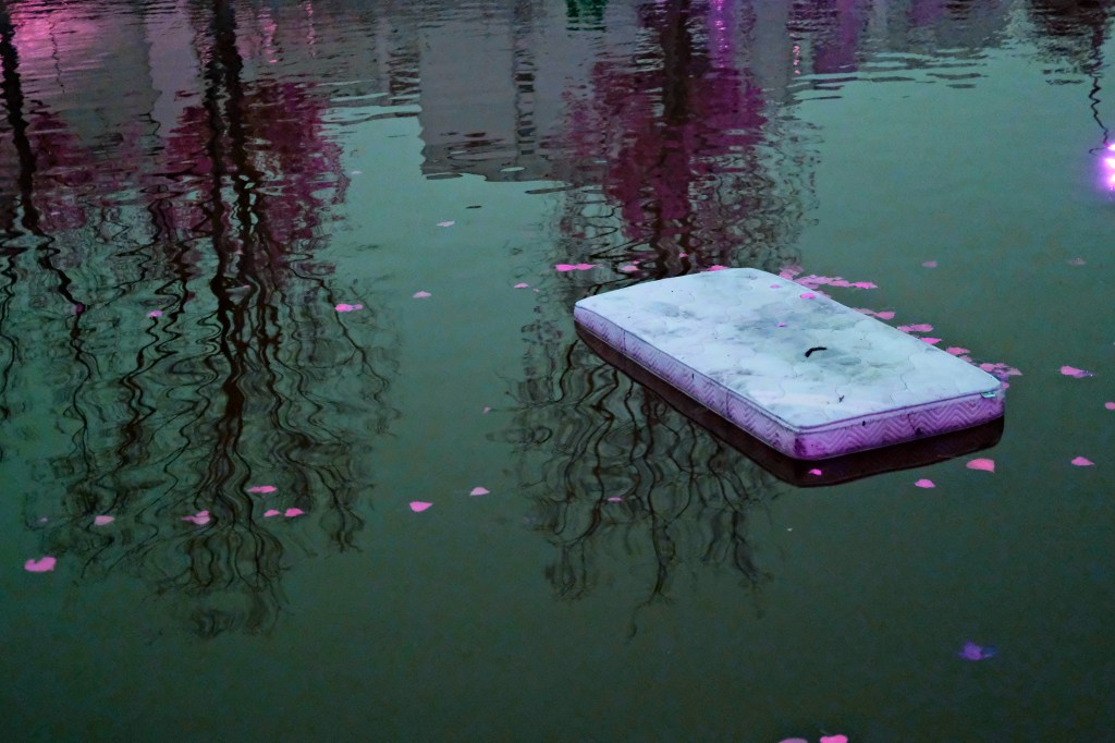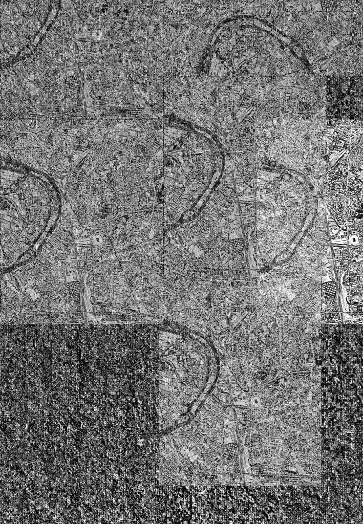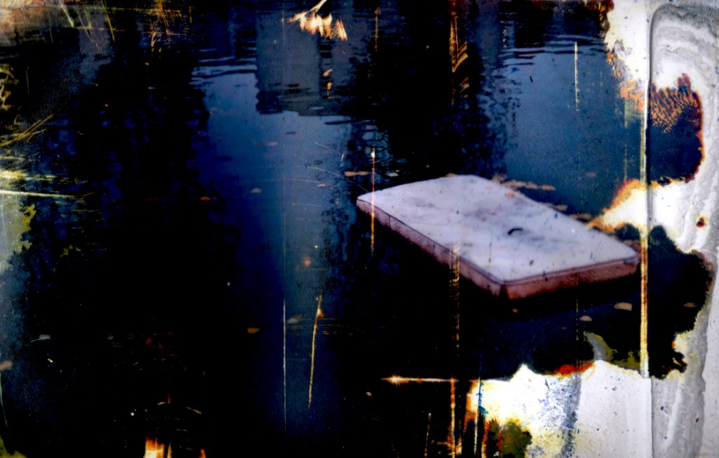 Amarrées, des barges boursouflées de sable et de gravats dessinent d’étranges bâtiments que tu dupliques à ta surface.